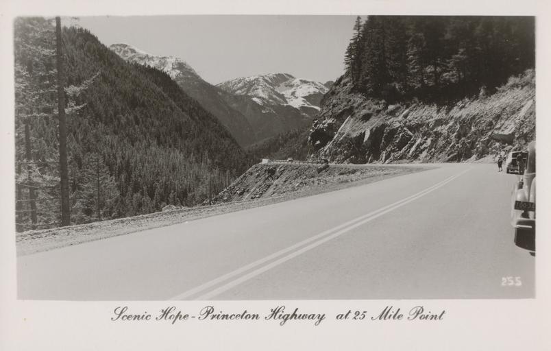 Keywords: photo border outdoor monochrome "Scenic Hope-Princeton Highway at 25 Mile Point" Post Card by J. C. Walker, Vancouver, B.C. Hope-Princeton Highway (Hwy. 3) at 25-Mile Point. 1950 photo. The Hope-Princeton Highway opened on November 2, 1949 and is part of the Southern Trans-Provincial Highway (Hwy. 3, a.k.a. the Crowsnest Highway) in British Columbia. "Scenic Hope-Princeton Highway at 25 Mile Point" Post Card by J. C. Walker, Vancouver, B.C. Hope-Princeton Highway (Hwy. 3) at 25-Mile Point. 1950 photo. The Hope-Princeton Highway opened on November 2, 1949 and is part of the Southern Trans-Provincial Highway (Hwy. 3, a.k.a. the Crowsnest Highway) in British Columbia. |
