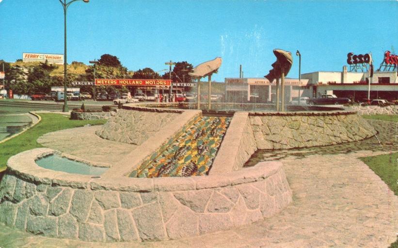 | Keywords: outdoor "Italian Fountain — The colourful Italian Fountain was presented in 1958 by Nanaimo citizens of Italian origin to the City of Nanaimo commemorating British Columbia's 100th anniversary. The fountain depicts the life of the salmon." Color Photo by W.J.L. Gibbons, AMPA. Published and distributed by Stan V. Wright & Co. Victoria, B.C.  Extant at Italian Square Park, Nanaimo, BC on Vancouver Island. "Italian Fountain — The colourful Italian Fountain was presented in 1958 by Nanaimo citizens of Italian origin to the City of Nanaimo commemorating British Columbia's 100th anniversary. The fountain depicts the life of the salmon." Color Photo by W.J.L. Gibbons, AMPA. Published and distributed by Stan V. Wright & Co. Victoria, B.C.  Extant at Italian Square Park, Nanaimo, BC on Vancouver Island. |