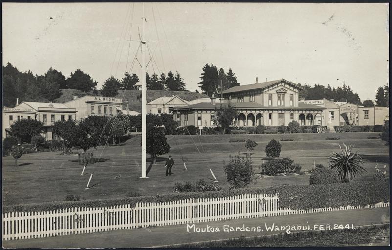 Keywords: outdoor photo border Photograph on postcard shows a view of Moutoa Gardens, with a flagpole in the grounds. Behind are an Exchange Mart, the Albion, the Commercial Hotel, stables (far right) and the courthouse. Quantity: 1 b&w photo-mechanical print(s) on postcard.. Physical Description: Photograph, 89 x 139 mm. [Postcard]. Moutoa Gardens, Wanganui. F.G.R. series 2441. Dominion of New Zealand post card; real photograph [1907-1910?].. [Postcard album of cards collected by the Gudopp family. ca 1905-1915].. Ref: Eph-B-POSTCARD-Vol-2-28. Alexander Turnbull Library, Wellington, New Zealand. natlib.govt.nz/records/23129978 Photograph on postcard shows a view of Moutoa Gardens, with a flagpole in the grounds. Behind are an Exchange Mart, the Albion, the Commercial Hotel, stables (far right) and the courthouse. Quantity: 1 b&w photo-mechanical print(s) on postcard.. Physical Description: Photograph, 89 x 139 mm. [Postcard]. Moutoa Gardens, Wanganui. F.G.R. series 2441. Dominion of New Zealand post card; real photograph [1907-1910?].. [Postcard album of cards collected by the Gudopp family. ca 1905-1915].. Ref: Eph-B-POSTCARD-Vol-2-28. Alexander Turnbull Library, Wellington, New Zealand. natlib.govt.nz/records/23129978 |