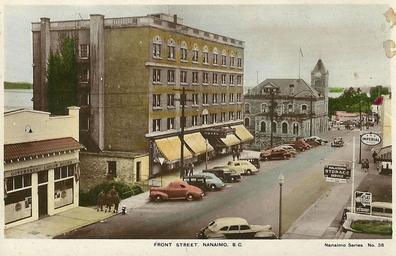 | Keywords: photo border outdoor "Front Street, Nanaimo, B. C. Nanaimo Series No. 38" Post Card. This is a Real Photograph. Hand Coloured. Copyright, J. Fred Spalding. Published by The Camera Products Co., 1731, Dunbar Street, Vancouver, B.C. Made in England.  Southerly view into the 000-block of Front Street in Nanaimo, BC on Vancouver Island. Visible is the Hotel Malaspina (1927-1996; center) and the Post Office building (right). "Front Street, Nanaimo, B. C. Nanaimo Series No. 38" Post Card. This is a Real Photograph. Hand Coloured. Copyright, J. Fred Spalding. Published by The Camera Products Co., 1731, Dunbar Street, Vancouver, B.C. Made in England.  Southerly view into the 000-block of Front Street in Nanaimo, BC on Vancouver Island. Visible is the Hotel Malaspina (1927-1996; center) and the Post Office building (right). |