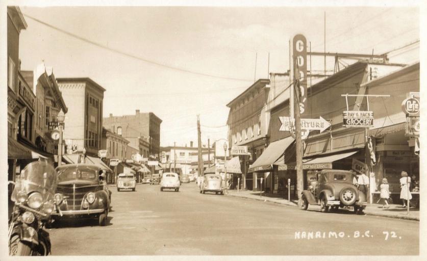 | Keywords: monochrome road "Nanaimo, B.C. 72."  View looking north up Commercial Street into the 000-block towards Skinner Street in Nanaimo, BC on Vancouver Island. "Nanaimo, B.C. 72."  View looking north up Commercial Street into the 000-block towards Skinner Street in Nanaimo, BC on Vancouver Island. |