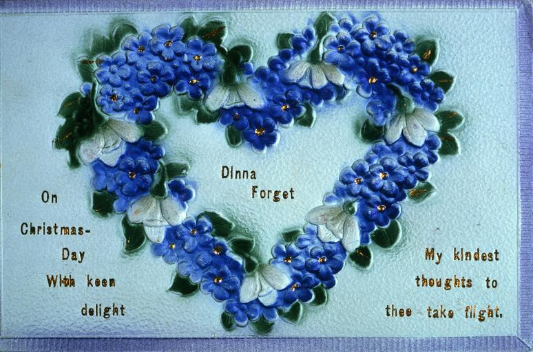 Keywords: Shows an embossed heart-shaped wreath of blue and white flowers, with text in gold. Inscriptions: Inscribed - Verso - centre: [Letter to May from Alice, her cousin]. . Quantity: 1 colour photo-mechanical print(s) on postcard.. Physical Description: Photolithograph, coloured, 90 x 140 mm. Provenance: Donated by Mrs R L Wilson in 1982. Wilson, R Lois (Mrs), fl 1990. [Postcard]. On Christmas Day with keen delight, Dinna forget, My kindest thoughts to thee take flight / J Beagles & Co. Ltd. E. C. Printers and Publishers. [1905-1910].. [Postcard album of cards collected by May Stephens. ca 1905-1915].. Ref: Eph-B-POSTCARD-Vol-1-110-2. Alexander Turnbull Library, Wellington, New Zealand. natlib.govt.nz/records/22873278 Shows an embossed heart-shaped wreath of blue and white flowers, with text in gold. Inscriptions: Inscribed - Verso - centre: [Letter to May from Alice, her cousin]. . Quantity: 1 colour photo-mechanical print(s) on postcard.. Physical Description: Photolithograph, coloured, 90 x 140 mm. Provenance: Donated by Mrs R L Wilson in 1982. Wilson, R Lois (Mrs), fl 1990. [Postcard]. On Christmas Day with keen delight, Dinna forget, My kindest thoughts to thee take flight / J Beagles & Co. Ltd. E. C. Printers and Publishers. [1905-1910].. [Postcard album of cards collected by May Stephens. ca 1905-1915].. Ref: Eph-B-POSTCARD-Vol-1-110-2. Alexander Turnbull Library, Wellington, New Zealand. natlib.govt.nz/records/22873278 |