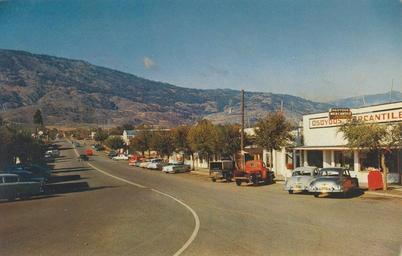 MAKE A MEME View Large Image ...The Business Section in Osoyoos, B.C." Made in Canada by Grant-Mann Lithographers Ltd. "Color Card" Division, Vancouver, British Columbia. Westward view up Main Street (Hwy. 3, the Southern Trans-Provincial ...