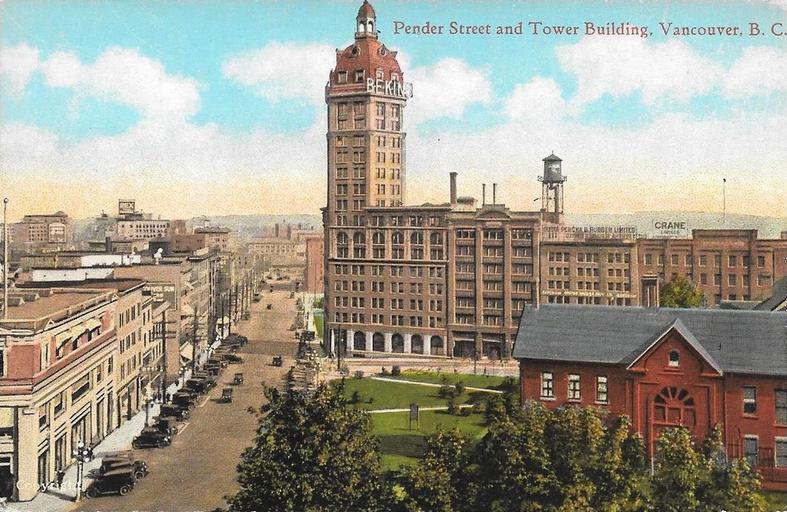 | Keywords: outdoor architecture building skyline city "Pender Street and Tower Building, Vancouver, B. C. Copyright" Post Card. Published by The Coast Publishing Co., Vancouver, B. C. Made in U S A. View looking east down West Pender Street from the intersection at Cambie Street in Vancouver, BC. The Sun Tower, 500 Beatty Street at West Pender Street, Vancouver, BC: Built 1911-12; extant. Originally called the World Building, Bekins Moving and Storage Company became its tenant from 1924 to 1937. It then became home of the Vancouver Sun newspaper (1937-65) where it became known as the Sun Tower. At the lower right is the former City Hospital (1889 addition) at 530 Cambie Street. "Pender Street and Tower Building, Vancouver, B. C. Copyright" Post Card. Published by The Coast Publishing Co., Vancouver, B. C. Made in U S A. View looking east down West Pender Street from the intersection at Cambie Street in Vancouver, BC. The Sun Tower, 500 Beatty Street at West Pender Street, Vancouver, BC: Built 1911-12; extant. Originally called the World Building, Bekins Moving and Storage Company became its tenant from 1924 to 1937. It then became home of the Vancouver Sun newspaper (1937-65) where it became known as the Sun Tower. At the lower right is the former City Hospital (1889 addition) at 530 Cambie Street. |