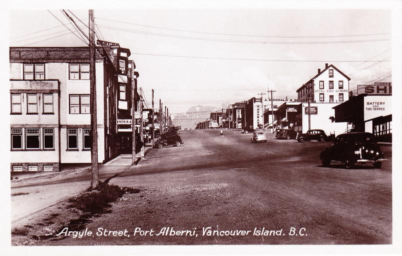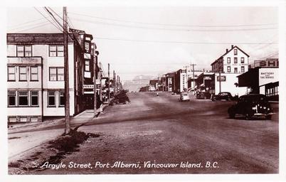 | Keywords: photo border outdoor "Argyle Street, Port Alberni, Vancouver Island, B.C." Post Card. Printed from a Real Photograph for B. O. Mills, Qualicum Beach, Vancouver Island, B.C. Made in England. Looking east up Argyle Street from the 5300-block towards the intersection at Kingsway Avenue in Port Alberni, BC on Vancouver Island. "Argyle Street, Port Alberni, Vancouver Island, B.C." Post Card. Printed from a Real Photograph for B. O. Mills, Qualicum Beach, Vancouver Island, B.C. Made in England. Looking east up Argyle Street from the 5300-block towards the intersection at Kingsway Avenue in Port Alberni, BC on Vancouver Island. |