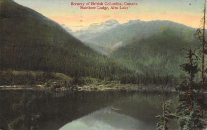 | Keywords: outdoor landscape mountainside "Scenery of British Columbia, Canada Rainbow Lodge, Alta Lake" Post Card. The Coast Publishing Co., Vancouver, B.C. Alta Lake, Whistler, BC. "Scenery of British Columbia, Canada Rainbow Lodge, Alta Lake" Post Card. The Coast Publishing Co., Vancouver, B.C. Alta Lake, Whistler, BC. |