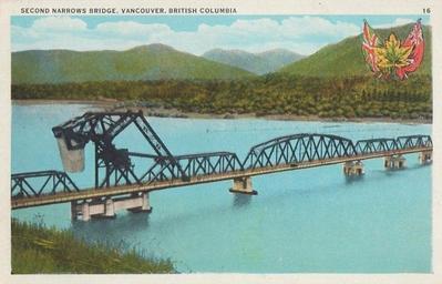| Keywords: photo border outdoor "Second Narrows Bridge, Vancouver, British Columbia 16" Low level rail and road bridge built in 1925 by the Burrard Inlet Tunnel and Bridge Co. Opened to traffic on November 7, 1925. Railway tracks connected to the CPR tracks at the south end and a short bascule span was installed near the south end for navigation rather than mid channel. With the strong riptides at the narrows, this led to many mishaps. The worst in September 1930 was when an empty hulk, Pacific Gatherer, a 300-ton log carrier under tow, wedged under the center span at low tide. When the tide rose, the span was lifted and dumped into Burrard Inlet. With the timing of the Great Depression, the crossing remained closed for 4 years. The bridge reopened on June 18, 1934 with the bascule span cut back and the large span to the north rebuilt as a 280-foot vertical lift span, hoisted between two new steel towers. Road crossing was replaced by a new, 6-lane high level Second Narrows Bridge (now the Ironworkers Memorial Bridge; built 1956-60). Highway traffic on the old bridge was ceased in 1963 when the bridge was sold to the CNR for $1. The CNR replaced the old rail crossing in 1969 on the east side with a larger, heavier medium level bridge with a similar vertical lift span which is normally kept partially raised. "Second Narrows Bridge, Vancouver, British Columbia 16" Low level rail and road bridge built in 1925 by the Burrard Inlet Tunnel and Bridge Co. Opened to traffic on November 7, 1925. Railway tracks connected to the CPR tracks at the south end and a short bascule span was installed near the south end for navigation rather than mid channel. With the strong riptides at the narrows, this led to many mishaps. The worst in September 1930 was when an empty hulk, Pacific Gatherer, a 300-ton log carrier under tow, wedged under the center span at low tide. When the tide rose, the span was lifted and dumped into Burrard Inlet. With the timing of the Great Depression, the crossing remained closed for 4 years. The bridge reopened on June 18, 1934 with the bascule span cut back and the large span to the north rebuilt as a 280-foot vertical lift span, hoisted between two new steel towers. Road crossing was replaced by a new, 6-lane high level Second Narrows Bridge (now the Ironworkers Memorial Bridge; built 1956-60). Highway traffic on the old bridge was ceased in 1963 when the bridge was sold to the CNR for $1. The CNR replaced the old rail crossing in 1969 on the east side with a larger, heavier medium level bridge with a similar vertical lift span which is normally kept partially raised. |