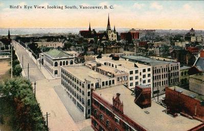 | Keywords: outdoor "Bird's Eye View, looking South, Vancouver, B. C." Post Card. Published by Novelty Post Card Co., Vancouver, B. C. Made in U. S. A.  View looking south down Hamilton Street from the Dominion Trust Building at 207 West Hastings Street in Vancouver, BC. "Bird's Eye View, looking South, Vancouver, B. C." Post Card. Published by Novelty Post Card Co., Vancouver, B. C. Made in U. S. A.  View looking south down Hamilton Street from the Dominion Trust Building at 207 West Hastings Street in Vancouver, BC. |