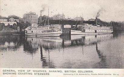 | Keywords: outdoor "General View of Wharves, Nanaimo, British Columbia, Showing Coasting Steamers. Published by T. N. Hibben & Co., Victoria, British Columbia. No. 107." Post Card.  Wharves at Nanaimo, BC on Vancouver Island. Visible are the coastal steamers S.S. Joan and S.S. City of Nanaimo. "General View of Wharves, Nanaimo, British Columbia, Showing Coasting Steamers. Published by T. N. Hibben & Co., Victoria, British Columbia. No. 107." Post Card.  Wharves at Nanaimo, BC on Vancouver Island. Visible are the coastal steamers S.S. Joan and S.S. City of Nanaimo. |