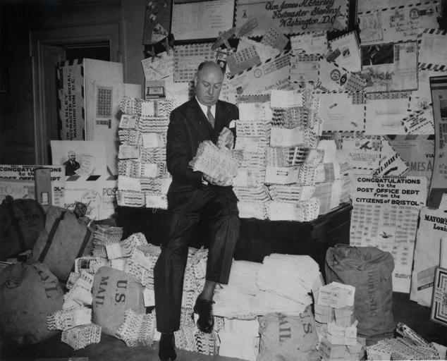 Keywords: smithsonian institution smithsonianinstitution postmaster james a farley jamesafarley usps celebration letters mail bags mailbags post post office postoffice clutter boxes black and white blackandwhite vintage stacks air mail week airmailweek 1938 mail us mail usmail looking at mail lookingatmail man a lot of mail alotofmail paper shoes three piece suit threepiecesuit mail bag mailbag photograph portrait package mail room mailroom postmaster general postmastergeneral james farley jamesfarley farley national postal museum nationalpostalmuseum mail across the commons mailacrossthecommons blackandwhite black and white Description: Postmaster General James A. Farley is shown sitting with some of the hundreds of thousands of letters mailed during National Air Mail Week, May 15-21, 1938. The national celebration honored the 20th anniversary of the first regularly scheduled airmail service. President Franklin Roosevelt and his Postmaster General encouraged everyone to send an airmail letter during the week-long event. Creator/Photographer: Unidentified photographer Medium: Black and white photographic print Culture: American Geography: USA Date: 1938 Collection: U.S. Airmail Service Repository: National Postal Museum Accession number: A.2008-28 Persistent URL: arago.si.edu/index.asp?con=2&cmd=1&id=194380 View more collections from the Smithsonian Institution. Description: Postmaster General James A. Farley is shown sitting with some of the hundreds of thousands of letters mailed during National Air Mail Week, May 15-21, 1938. The national celebration honored the 20th anniversary of the first regularly scheduled airmail service. President Franklin Roosevelt and his Postmaster General encouraged everyone to send an airmail letter during the week-long event. Creator/Photographer: Unidentified photographer Medium: Black and white photographic print Culture: American Geography: USA Date: 1938 Collection: U.S. Airmail Service Repository: National Postal Museum Accession number: A.2008-28 Persistent URL: arago.si.edu/index.asp?con=2&cmd=1&id=194380 View more collections from the Smithsonian Institution. |