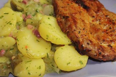 Keywords: potato salad meat sausage eat fried sauce lunch food piquant sharp banquet gastronomy meat products
