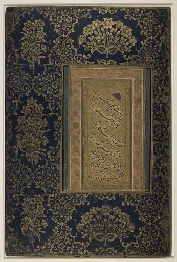 | Keywords: Prayers for Safety and Success.png en This calligraphic fragment includes verses in Persian praying for the patron's personal well-being and the prosperity of his kingdom The verses read May the world be your fortune and the firmament your friend / May the World-Creator God protect you / May all your works be successful / May God of the World look after you / May your heart and your kingdom be collected and well-frequented / May division stay far away from your realm The verses are executed in black nasta'liq script on beige paper They are framed by cloud bands and placed on a gold background decorated with vine motifs and blue flowers Salmon and blue borders decorated with gold-painted flowers and leaves frame the text panel which is pasted to a larger blue sheet decorated with gold bouquets The entire fragment is backed by cardboard for strengthening purposes The upper right triangle of the text panel includes an ornamental blue finial the lower left triangular panel the signature of the calligrapher Mir 'Ali who designates himself as the poor al-faqir Mir 'Ali Heravi died 1543 951 AH a calligrapher in nasta'liq script was active in the city of Herat Afghanistan during the 16th century until he was taken to Bukhara Uzbekistan in 1528-9 935 AH by the Shaybanid ruler 'Ubaydallah Khan Uzbek fa دست ŒÙ†ÙˆØ´ØªÙ‡ از دعایی به خط نستعلیق به قلم میر علی هروی century 16 CE http //www wdl org/en/item/2431/ Prayers for Safety and Success Creator Mir Ali Heravi Custom license marker 2012 09 09 PD-old-100 Mir Ali Heravi Persian manuscripts Manuscripts in Aghanistan Art of Herat 16th-century manuscripts Prayer Nastaliq Images from the World Digital Library Library of Congress Arabic Persian and Ottoman calligraphy collection |