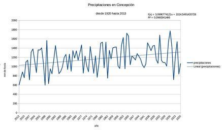 | Keywords: Precipitaciones en Concepción 2013-1920.png es Precipitaciones en Concepción Biobio Chile Se muestra un claro descenso en la intensidad de las precipitaciones como así lo confirma la línea de tendencia con sus respectivas ecuaciones al extremo superior derecho ; así como también las respectivas variaciones de los fenómenos del Niño y la Niña Eje x años Eje y milímetros de lluvia caídos Datos tomados desde los informes meteorológicos anuales de la Dirección Meteorológica de Chile; se toman en cuenta los datos de Carriel Sur desde su inauguración salvo en 1979 con un dato estimado faltaba el mes de diciembre 1964 noviembre 1958 diciembre ; y con los datos de hualpencillo en 1967 1963; de la Universidad de Concepción entre 1961 y 1959; de Punta Hualpén en 1941 http //164 77 222 61/climatologia/php/menuAnuarios php en Rainfall in Concepción Biobio Chile It shows a clear decline in the intensity of rainfall as well as confirms the trend line with their respective equations to top right ; as well as the respective variations of the phenomena of the Child X-axis years y-axis millimeters of rain fallen Data taken from the annual weather reports Meteorological Direction of Chile; Carriel Sur data are taken into account since its inauguration in 1979 saved an estimated data missing the month of December 1964 November 1958 December ; and data Hualpencillo 1967 1963; University of Conception between 1961 and 1959; Punta Hualpén in 1941 de Niederschlagsmenge in Concepción Biobio Chile Es zeigt einen deutlichen Rückgang in der Intensität der Niederschläge sowie bestätigt die Trendlinie mit ihren jeweiligen Gleichungen nach rechts oben ; sowie den jeweiligen Veränderungen der Phänomene des Kindes X-Achse Jahre y-Achse Millimeter regen gefallen Daten aus der jährlichen Wetter genommen berichtet Meteorological Richtung Chile; Carriel Sur Daten berücksichtigt werden seit seiner Eröffnung im Jahr 1979 gerettet geschätzte Daten fehlende Monat Dezember 1964 November 1958 Dezember ; und Daten Hualpencillo 1967 1963; University of Conception zwischen 1961 und 1959; Punta Hualpén 1941 pt Chuvas em Concepción Biobio Chile Ele mostra um claro declínio na intensidade das chuvas bem como confirma a linha de tendência com suas respectivas equações para o topo direito ; bem como as respectivas variações dos fenômenos da Criança X-eixo anos eixo y milímetros de chuva caíram Dados extraídos do tempo relatórios anuais Direção Meteorológica do Chile; Dados Carriel Sur são tidos em conta desde a sua inauguração em 1979 salvo um conjunto de dados estimados faltando o mês de dezembro 1964 novembro de 1958 dezembro ; e dados Hualpencillo 1967 1963; Universidade da Conceição entre 1961 e 1959; Punta Hualpén em 1941 2015-05-07 own Tadeoska other versions cc-zero Uploaded with UploadWizard Climatografía Clima Clima en el Biobio Chile Biobio Precipitaciones Clima en Suramérica |