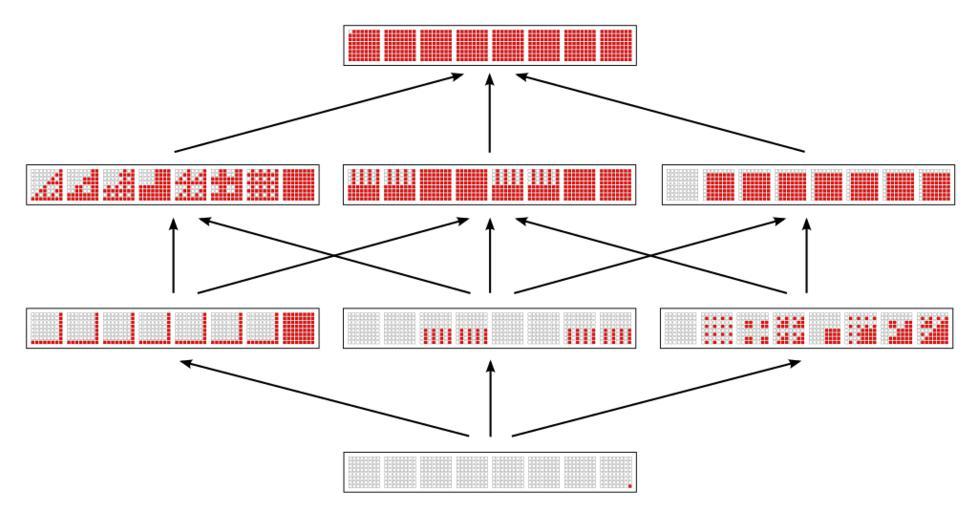| Keywords: Predicate logic; 2 variables; implications; 3x3 list.svg Implications between statements in predicate logic <br> represented by sets of logical matrices for the case that there are 3 individuals <br><br> A matrix is in the set when it's marked red <br> The bottom set is this one 400px http //upload wikimedia org/wikipedia/commons/thumb/a/af/Predicate_logic 3B_2_variables 3B_3x3_list 3B_12f svg/2048px-Predicate_logic 3B_2_variables 3B_3x3_list 3B_12f svg png zoom in <br> It contains only the matrix <math>\begin pmatrix 1 1 1 \\ 1 1 1 \\ 1 1 1 \end pmatrix </math> Inkscape own 2011 mate2code Predicate logic; 2 variables; full Hasse diagram Predicate logic; 2 variables; 3x3 list Predicate logic; 2 variables; coinciding variables |