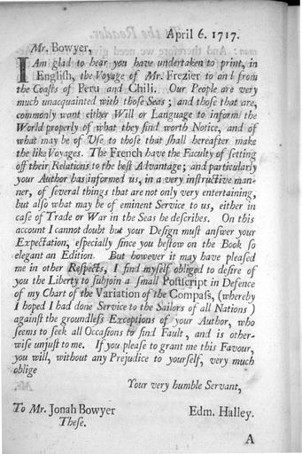 Keywords: Préface Halley.jpg Edmond Halley's text A voyage to the south-sea and along the coasts of Chili and Peru in the years 1712 1713 and 1714 by Monsieur Frezier Exemplaire de la bibliothèque patrimoniale de Gray 70100 France 1717 Edmond Halley scan Jeffdelonge <span class signature-talk >talk</span> PD-old-100 Frézier's travel Edmond Halley |