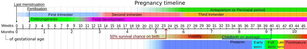 Keywords: Pregnancy timeline.svg pregnancy by weeks and months of gestational age own Mikael Häggström 2013-10-27 thumb left png-format <br />thumb left in Latvian<br/>thumb left in Arabic Cc-zero Human pregnancy