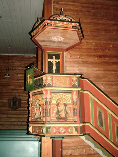 Keywords: Prekestol Vallsetkrk.jpg Prekestolen i Vallset kirke er fra 1686 og antagelig laget av Johannes Larsen Skraastad Vang Vallset kirke Pulpits in Norway Johannes Skraastad