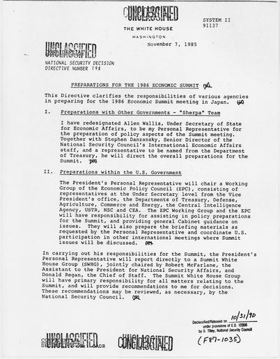 | Keywords: Preparations for the 1986 Economic Summit - NARA - 198313.tif Scope and content General notes 198313 Local identifier President 1981-1989 Reagan National Security Council 1981 - 1989 Ronald Reagan Library NLRR 40 Presidential Drive Simi Valley CA 93065-0600 1985-11-07 Record group Collection RR-NSC Numbered National Security Policy Papers 1981 - 1989 Record group ARC 1189 National Security Decision Directives compiled 02/25/1981 - 01/19/1989 Series ARC 198166 File unit File unit ARC Variant control numbers NAIL Control Number NLS-NSC-NSDD-198 yes Other versions <gallery> File Preparations_for_the_1986_Economic_Summit_-_NARA_-_198313 tif tif File Preparations_for_the_1986_Economic_Summit_-_NARA_-_198313 jpg jpg </gallery> NARA-cooperation PD-USGov Presidential Decision Directives Reagan NARA TIF images with categorized JPGs |