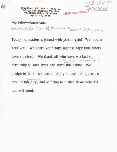 Keywords: President Bill Clinton's Eulogy for the Bombing Victims in Oklahoma City 1995.png en The United States President Bill Clinton's address to the victims of the Oklahoma City Bombing terrorist attack on April 23 1995 595142 President William J Clinton 1995-04-23 File President Bill Clinton's Eulogy for the Bombing Victims in Oklahoma City 1995 jpg JPEG PD-USGov Bill Clinton Eulogies Oklahoma City bombing Speeches by Presidents of the United States |