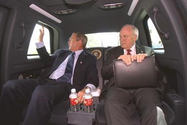 View Original:President_Bush_and_Vice_President_Cheney_in_the_Presidential_Limousine.jpg (3072x2048)