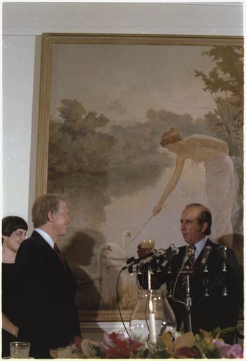 Keywords: President Carlos Perez toasts Jimmy Carter during a state visit to Venezuela. - NARA - 178543.tif Scope and content General notes 178543 Local identifier President 1977-1981 Carter White House Staff Photographers 01/20/1977 - 01/20/1981 Jimmy Carter Library NLJC 441 Freedom Parkway Atlanta GA 30307-1498 1978-03-28 Record group Collection JC-WHSP Carter White House Photographs Collection 01/20/1977 - 01/22/1981 Record group ARC 1120 Carter White House Photographs Presidential compiled 01/20/1977 - 01/22/1981 Series ARC 173341 File unit Jimmy Carter Rosalynn Carter - Caracas Venezuela 03/28/1978 - 03/28/1978 File unit ARC 178542 Variant control numbers NAIL Control Number NLC-WHSP-C-04890-28 yes Other versions NARA-cooperation PD-USGov Carlos Andrés Pérez Jimmy Carter with national leaders State visits Relations of the United States and Venezuela |