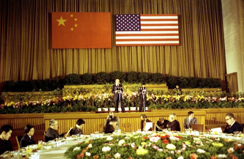 Keywords: President Ford makes remarks in the People's Republic of China - NARA - 7062599.jpg This photograph depicts President Ford making remarks at a Reciprocal Dinner in honor of the People's Republic of China PRC Official Party that he and First Lady Betty Ford hosted in the Peking Room of the Great Hall of the People 7062599 Creator Karl Schumacher Gerald R Ford Presidential Library http //www fordlibrarymuseum gov/avproj/State_Trips_PRC asp A7580-04A Institution Gerald R Ford Presidential Library 1975-12-04 Gerald R Ford Presidential Library and Museum-cooperation PD-USGov Uploaded with UploadWizard 1975 State Visit to China photo kit at the Gerald R Ford Presidential Library 1975 in China Relations of the People's Republic of China and the United States Gerald Ford in 1975 Public speaking Interior of Great Hall of the People Photographs of flags of the People's Republic of China Photographs of flags of the United States Flags in China State dinners |