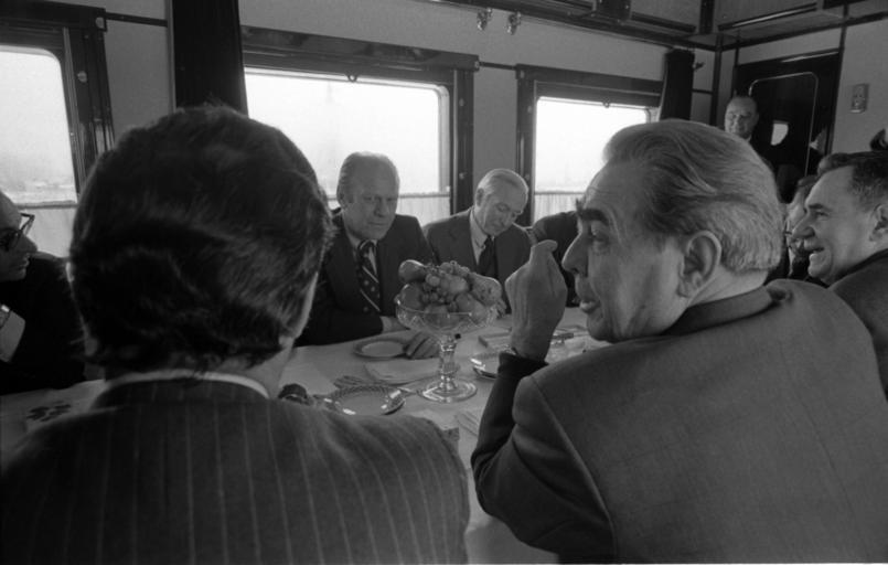 Keywords: President Ford travels to the Vladivostok Summit Meeting, 1974 - NARA - 7158147.jpg Photograph of the American Official Party and the Soviet Welcoming Committee traveling by train from Vozdvizhenka Airport to the site of the Summit Meetings on Arms Control at Okeansky Sanatorium Vladivostok U S S R 7158147 Creator David Hume Kennerly Gerald R Ford Presidential Library http //www fordlibrarymuseum gov/library/exhibits/vladivostok/varrival asp A2107-36A Institution Gerald R Ford Presidential Library 1974-11-23 Gerald R Ford Presidential Library and Museum-cooperation PD-USGov Uploaded with UploadWizard 1974 State Visit to the USSR photo kit at the Gerald R Ford Presidential Library 1974 in Vladivostok Rail transport in the Soviet Union Gerald Ford in 1974 Gerald Ford and Leonid Brezhnev Photographs by David Hume Kennerly from 1974 |