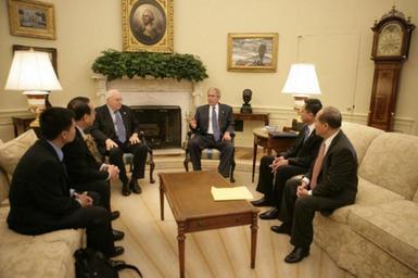 | Keywords: President George Bush and Vice President Dick Cheney meet with Vietnamese Democracy and Human Rights Activists.jpg George Bush and Vice President Dick Cheney meet with Vietnamese Democracy and Human Rights Activists on May 29th 2007 From left to right Thanh Cong Do founding member of People's Democratic Party of Vietnam; Nguyen Le Minh Vietnam Human Rights Network chair; Vice Presient Dick Cheney U S President George W Bush Diem Do Vietnam Reform Party chairman; and Quan Nguyen chair of the International Committee For Freedom To Support The Non-Violent Movement For Human Rights In Vietnam Bush was meeting with the four U S citizens to show disapproval of the Vietnam government's harsh treatment of its opponents Dick Cheney tổng thống George Bush ông Đỗ Hoàng Điềm và bác sĩ Nguyễn Quốc Quân Le président de Viet Tan Do Hoang Diem 2e depuis la droite rencontre le président des États-Unis George Bush et le vice-président Dick Cheney le 29 mai 2007 en les encourageant fortement à mettre davantage de pression sur le Vietnam pour respecter les droits de l'homme 2007-05-29 http //georgewbush-whitehouse archives gov/news/releases/2007/05/images/20070529-3_p052907jb-0202-515h html Joyce N Boghosian; White House photographer PD-USGov Uploaded with UploadWizard White House in 2007 Vietnam Reform Party Overseas Vietnamese organizations Vietnamese diaspora in the United States |