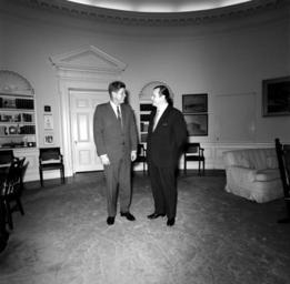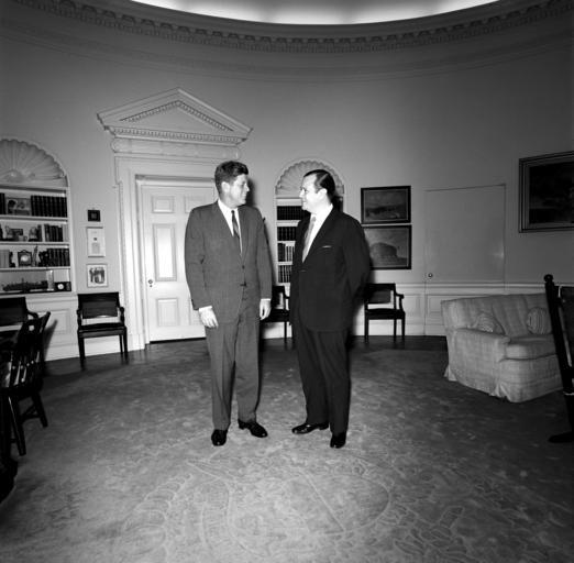 Keywords: u.s. national archives usnationalarchives jfk presidential library jfkpresidentiallibrary blackandwhite monochrome indoor black and white Original Caption: President John F. Kennedy with Unidentified Visitor We are looking for your help in identifying unknown people in our White House Photographs collection. If you have any information about this photograph, please post a comment, including any relevant sources, for the catalogers at the John F. Kennedy Presidential Library. Thank you! Local Identifier: JFKWHP-ST-302-1-62 Created By: President (1961-1963 : Kennedy). Office of the Naval Aide to the President. (1961 - 1963) From: President (1963-1969 : Johnson). White House Photograph Office. (1963 - 1969) Contact: John F. Kennedy Library (LP-JFK), Columbia Point Boston, MA 02125-3398 Phone: 617-514-1600 Fax: 617-514-1652 Email: kennedy.library@nara.gov Production Dates: 7/3/1962 Scope and Content Note: In this photograph,President John F. Kennedy stands with an unidentified guest (right) in the Oval Office, White House, Washington, D.C. Persistent URL: JFK Library URL: www.jfklibrary.org/Asset-Viewer/Archives/JFKWHP-ST-302-1-... Access Restrictions: Unrestricted Use Restrictions: Unrestricted Original Caption: President John F. Kennedy with Unidentified Visitor We are looking for your help in identifying unknown people in our White House Photographs collection. If you have any information about this photograph, please post a comment, including any relevant sources, for the catalogers at the John F. Kennedy Presidential Library. Thank you! Local Identifier: JFKWHP-ST-302-1-62 Created By: President (1961-1963 : Kennedy). Office of the Naval Aide to the President. (1961 - 1963) From: President (1963-1969 : Johnson). White House Photograph Office. (1963 - 1969) Contact: John F. Kennedy Library (LP-JFK), Columbia Point Boston, MA 02125-3398 Phone: 617-514-1600 Fax: 617-514-1652 Email: kennedy.library@nara.gov Production Dates: 7/3/1962 Scope and Content Note: In this photograph,President John F. Kennedy stands with an unidentified guest (right) in the Oval Office, White House, Washington, D.C. Persistent URL: JFK Library URL: www.jfklibrary.org/Asset-Viewer/Archives/JFKWHP-ST-302-1-... Access Restrictions: Unrestricted Use Restrictions: Unrestricted |