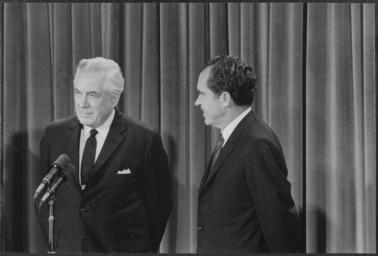 Keywords: President Nixon looks on as the newly appointed chief justice of the Supreme Court, Warren Burger, says a few remarks - NARA - 194632.tif Scope and content Pictured Chief Justice Warren Burger President Richard Nixon Subject Supreme Court Members General notes 194632 Local identifier NLRN-WHPO-1117-04A General Services Administration National Archives and Records Service Office of Presidential Libraries Office of Presidential Papers 01/20/1969 - ca 12/1974 Most Recent <br /> President 1969-1974 Nixon White House Photo Office 1969 - 1974 Most Recent NARA-Author Atkins Oliver F 1916-1977 Photographer 8451334 <br /> Richard Nixon Library NLRN 18001 Yorba Linda Boulevard Yorba Linda CA 92886 1969-05-21 Record group Collection RN-WHPO White House Photo Office Collection Nixon Administration 01/20/1969 - 08/09/1974 Record group ARC 1179 Nixon White House Photographs compiled 01/20/1969 - 08/09/1974 documenting the period 08/08/1968 - 08/09/1974 Series ARC 194277 File unit File unit ARC Variant control numbers NAIL Control Number NLNP-WHPO-MPF-1117 04A yes Other versions NARA-cooperation PD-USGov Photographs by Ollie Atkins |
