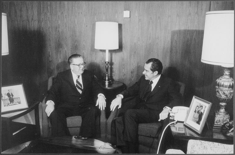 Keywords: President Nixon meeting with Frank Fitzsimmons, President of the International Brotherhood of Teamsters - NARA - 194487.tif Scope and content Pictured Frank Fitzsimmons Richard M Nixon Subject Labor General notes 194487 Local identifier NLRN-WHPO-E0207-03 General Services Administration National Archives and Records Service Office of Presidential Libraries Office of Presidential Papers 01/20/1969 - ca 12/1974 Most Recent <br /> President 1969-1974 Nixon White House Photo Office 1969 - 1974 Most Recent NARA-Author Atkins Oliver F 1916-1977 Photographer 8451334 <br /> Richard Nixon Library NLRN 18001 Yorba Linda Boulevard Yorba Linda CA 92886 1973-02-12 Record group Collection RN-WHPO White House Photo Office Collection Nixon Administration 01/20/1969 - 08/09/1974 Record group ARC 1179 Nixon White House Photographs compiled 01/20/1969 - 08/09/1974 documenting the period 08/08/1968 - 08/09/1974 Series ARC 194277 File unit File unit ARC Variant control numbers NAIL Control Number NLNP-WHPO-MPF-E0207 03 yes Other versions NARA-cooperation PD-USGov Photographs by Ollie Atkins |