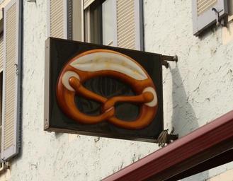 Keywords: pretzel baker bakery advertising shield home facade note craft board