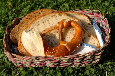 Keywords: pretzel bread bread slices basket breakfast food half broken
