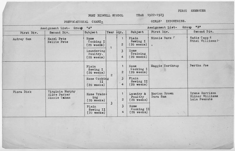 Keywords: Prevocational chart, girls' industries, Fort Bidwell School. - NARA - 296109.tif Scope and content This document illustrate aspects of Federal policy towards Native Americans and its execution with regard to Native American education during the early twentieth century preceding passage of the Indian Reorganization Act General notes 296109 Local identifier Department of the Interior Office of Indian Affairs Fort Bidwell School and Agency 1898 - 1936 NARA's Pacific Region San Bruno NRHAS 1000 Commodore Drive San Bruno CA 94066-2350 1922 Record group Record Group 75 Records of the Bureau of Indian Affairs 1793 - 1999 Record group ARC 404 Records of Fort Bidwell School Calendar and Programs compiled 1910 - 1929 Series ARC 296103 File unit Calendars and Programs 1910 - 1929 File unit ARC 296104 Variant control numbers NAIL Control Number NRHS-75-BIDWLENT18-CALENDARS-5 yes Other versions <gallery> File Prevocational_chart _girls'_industries _Fort_Bidwell_School _-_NARA_-_296109 tif tif File Prevocational_chart _girls'_industries _Fort_Bidwell_School _-_NARA_-_296109 jpg jpg </gallery> NARA-cooperation PD-USGov Fort Bidwell Indians Native American schools Education in California 1922 in California NARA TIF images with categorized JPGs |