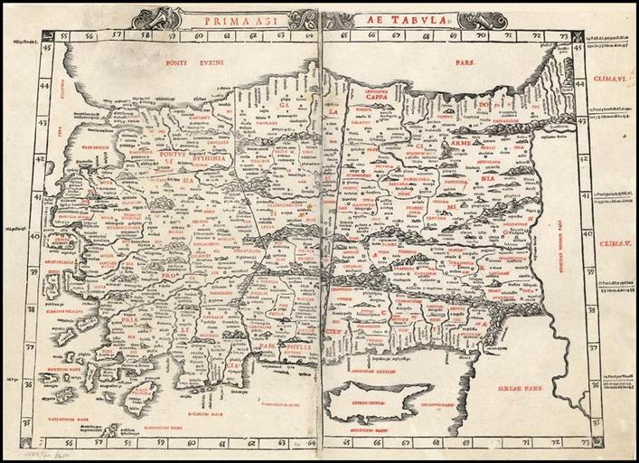 Keywords: Prima Asiae Tabula.jpg In prima Tabula Pontus Bithynia Quae propriae Asiae dicitur Turcia Phrygia Lycia Galatia Paphlagonia Pamphylia Cappadocia Armenia minor Cilycia en The first Asian map depicting Roman Anatolia from the 1511 Venetian edition of Ptolemy's Geography edited by Bernardus Sylvanus Evoliensis Bernardo da Silva of Eboli and published by Jacobus Pentius de Leucho Jacopo Pencio of Leccho 1511 https //www raremaps com/gallery/detail/13986 view print Rare Maps Ptolemy other versions <gallery> File Prima Asiae Tabula II jpg </gallery> PD-old-70-1923 1511 Ptolemy Asia 01 1511 maps Ptolemy's 1st Asian Map 1511 Maps in Latin |