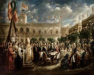 Keywords: Primera piedra del Monumento a San Fernando.jpg La escena representa el acto de la colocación de la primera piedra del monumento a San Fernando en la ciudad de Sevilla que tuvo lugar en marzo de 1877 En primer plano aparecen y a la derecha los duques de Montpensier con sus hijas y al fondo la reina Isabel II de España con sus hijas las infantas Y junto a la mesa en la que el rey Alfonso XII de España firma el documento aparecen el alcalde José María Ybarra Gutiérrez de Caviedes conde de Ybarra Francisco de Borja Queipo de Llano conde de Toreno el presidente del Gobierno Antonio Cánovas del Castillo el capitán general Fernando Primo de Rivera Manuel Silvela el jefe de la oposición y un prelado 1877 oil canvas Size cm 190 153 Institution Casa consistorial de Sevilla Salón Santo Tomás http //patrimoniumhispalense com/es/espacio/casa-consistorial/alfonso-xii-firmando-el-acta-de-colocacion-de-la-primera-piedra-del-monumento-a-san-fernando object history exhibition history credit line accession number http //patrimoniumhispalense com/es/espacio/casa-consistorial/alfonso-xii-firmando-el-acta-de-colocacion-de-la-primera-piedra-del-monumento-a-san-fernando PD-old-100 Uploaded with UploadWizard Paintings in the Town hall of Seville Paintings of Alfonso XII of Spain Historical images of Seville José María Romero López 1877 in Andalusia