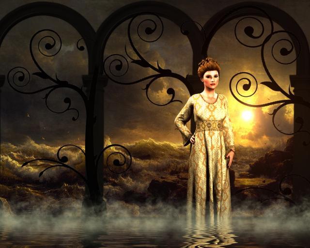 Keywords: princess fairy tales woman mystical romantic dress queen love fairytale hair pretty beautiful history bride girl storybook water sea clouds sun sunset sunbeam fog mirroring water level legendary saage schoerkel