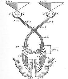 Keywords: Principles of Psychology (James) v1 p49.png en The human brain mechanism of vision <P>Fig 15 ”Scheme of the mechanism of vision after Seguin The cuneus convolution Cu of the right occipital lobe is supposed to be injured and all the parts which lead to it are darkly shaded to show that they fail to exert their function F O are the intra-hemispheric optical fibres P O C is the region of the lower optic centres corpora geniculata and quadrigemina T O D is the right optic tract; C the chiasma; F L D are the fibres going to the lateral or temporal half T of the right retina; and F C S are those going to the central or nasal half of the left retina O D is the right and O S the left eyeball The rightward half of each is therefore blind in other words the right nasal field R N F and the left temporal field L T F have become invisible to the subject with the lesion at Cu </P> <P>From the first edition of The Principles of Psychology by William James 1890 vol I page 49 <P> 1890 https //archive org/details/principlesofpsyc001jame Internet Archive scan of the book William James other versions PD-old-100-1923 Principles of Psychology 1890 Illustrations of the human brain Visual impairment |