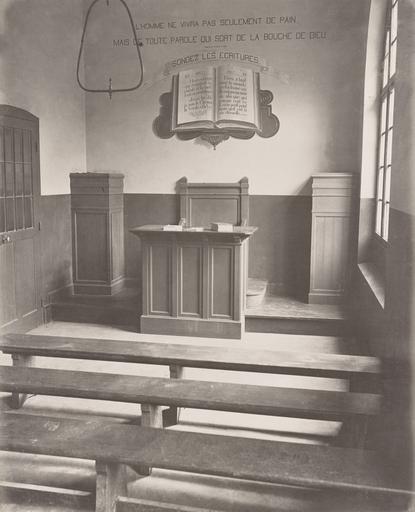 | Keywords: Prison de la Santé - Oratoire.jpg  Photograph Creator Hippolyte-Auguste Collard en City Police Préfecture Paris en Prison de la Santé Oratoire room with bench seats raised desk in front with painting of an open bible on wall behind Biblical quote on wall Man does not live on bread alone but on every word which comes from the mouth of God depicted people depicted place between 1876 1880 albumen silver 66 5 x 57 cm accession number H87 208/25 SLVIC-digitalimage 273521 H87 208/25 Album with leather covered cardboard covers 148 cardboard leaves holding 69 albumen silver print photographs on one side of leaf only Individual titles and official photographer stamped below image Title embossed on front cover with seal of the City of Paris in gilt ink ; title also on spine Label inside front cover reads Presented to the Public Library c Victoria on the eighth day of April 1881 by the Government of France Hand inscribed note on first page of album upper left Presented April 8th 1881 illegible Photographs various sizes 38 x 27 cm and smaller <br> Album was designed to show the use of photography in the solving of crimes and disasters Gift of the French Government possibly following the International Exhibition of 1880 <br> Official photographer's stamp on each page lower left some images dated 1876 and 1880 One photographer identified Hippolyte-Auguste Collard Institution State Library of Victoria object history exhibition history credit line Gift; Government of France; 1881 Information field Author Préfecture de police de Paris Service Photographique PD-100 Prison de la Santé Ville de Paris Préfecture de police Images of Paris from the State Library of Victoria Oratories in Paris |