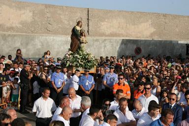 | Keywords: roquetas de mar roquetasdemar fiestas roquetas de mar fiestasroquetasdemar fiestas santa ana roquetas de mar fiestassantaanaroquetasdemar fiestas el puerto roquetas de mar fiestaselpuertoroquetasdemar procesión santa ana procesiónsantaana people crowd El 26 de julio volvió a ser un día grande para El Puerto de Roquetas de Mar. La procesión en honor a la Virgen del Carmen y Santa Ana reunió a miles de personas que arroparon a las imágenes en el recorrido por las calles del barrio. Los vecinos y visitantes vivieron la procesión con intensidad y exaltación, y los vítores a la Virgen y Santa Ana fueron constantes. Por la mañana se celebraba la Santa Misa solemne en el tercer y último día del Triduo. Por la tarde, pasadas las 18 horas, comenzaba la procesión. Las imágenes estuvieron acompañadas por la música de la Banda de Música de Loja y de la Unión Musical Roquetas de Mar. Desde la Parroquia de Santa Ana se llegaba a la Calle El Faro y después hasta la explanada del Faro de Roquetas de Mar. En este punto se llevó a cabo una de las principales tradiciones de estas fiestas, el lavado de cara a Santa Ana. Gabriel Amat, alcalde de Roquetas de Mar, hizo el lavado, así como Marta López, que fue designada en el sorteo. Juani Cruz, también por sorteo, fue la persona que portó el agua para el lavado. Después la procesión continuó en dirección al muelle pesquero bordeando el Castillo de Santa Ana para iniciar la procesión marítima hacia Aguadulce. La imagen de la Virgen del Carmen procesionó en el barco Salvador El Fortuna, mientras que la de Santa Ana lo hizo en el Rompemares. Antes de llegar a Aguadulce se lanzaron cohetes en honor a la Virgen y a Santa Ana. En el Puerto Deportivo de Aguadulce se rezó a las imágenes, y se partió de nuevo hacia el Puerto de Roquetas de Mar. En alta mar también se lanzaron flores en memoria de los pescadores. Pasadas las 21 horas la procesión volvía a tierra y recorría la zona del ferial en dirección hacia la Iglesia del Puerto. Una vez en este punto, y con la presencia de miles de personas en la plaza, se lanzaba un espectacular castillo de fuegos artificiales con el que se ponía fin a la procesión. Antes de regresar las imágenes al templo se interpretó el himno de España que sirvió como despedida. El 26 de julio volvió a ser un día grande para El Puerto de Roquetas de Mar. La procesión en honor a la Virgen del Carmen y Santa Ana reunió a miles de personas que arroparon a las imágenes en el recorrido por las calles del barrio. Los vecinos y visitantes vivieron la procesión con intensidad y exaltación, y los vítores a la Virgen y Santa Ana fueron constantes. Por la mañana se celebraba la Santa Misa solemne en el tercer y último día del Triduo. Por la tarde, pasadas las 18 horas, comenzaba la procesión. Las imágenes estuvieron acompañadas por la música de la Banda de Música de Loja y de la Unión Musical Roquetas de Mar. Desde la Parroquia de Santa Ana se llegaba a la Calle El Faro y después hasta la explanada del Faro de Roquetas de Mar. En este punto se llevó a cabo una de las principales tradiciones de estas fiestas, el lavado de cara a Santa Ana. Gabriel Amat, alcalde de Roquetas de Mar, hizo el lavado, así como Marta López, que fue designada en el sorteo. Juani Cruz, también por sorteo, fue la persona que portó el agua para el lavado. Después la procesión continuó en dirección al muelle pesquero bordeando el Castillo de Santa Ana para iniciar la procesión marítima hacia Aguadulce. La imagen de la Virgen del Carmen procesionó en el barco Salvador El Fortuna, mientras que la de Santa Ana lo hizo en el Rompemares. Antes de llegar a Aguadulce se lanzaron cohetes en honor a la Virgen y a Santa Ana. En el Puerto Deportivo de Aguadulce se rezó a las imágenes, y se partió de nuevo hacia el Puerto de Roquetas de Mar. En alta mar también se lanzaron flores en memoria de los pescadores. Pasadas las 21 horas la procesión volvía a tierra y recorría la zona del ferial en dirección hacia la Iglesia del Puerto. Una vez en este punto, y con la presencia de miles de personas en la plaza, se lanzaba un espectacular castillo de fuegos artificiales con el que se ponía fin a la procesión. Antes de regresar las imágenes al templo se interpretó el himno de España que sirvió como despedida. |