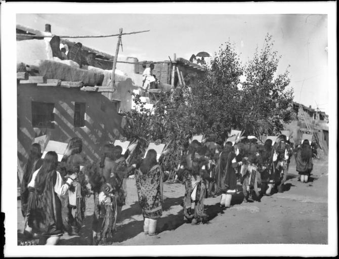 Keywords: Procession for the Fiesta de San Esteban, Acoma Pueblo, 1886 (CHS-4535).jpg en <br> Procession for the Fiesta de San Esteban Acoma Pueblo 1886 Photograph of a procession for the Fiesta de San Esteban Acoma Pueblo 1886 A procession of about a dozen Acoma Indians are visible from the back dancing in front of the kisi They are wearing traditional garments including elaborate headpieces The kisi is located in the grouping in the center of trees and shrubs The building behind the dancers is made of adobe and wood The rafter tails are exposed Ladders lean against the buildings which are pierced with windows Several onlookers observe from the roof of the building Call number CHS-4535 Legacy record ID chs-m16870; USC-1-1-1-13461 Photographer James George Wharton Filename CHS-4535 Coverage date 1886 Part of collection California Historical Society Collection 1860-1960 Type images Geographic subject city or populated place Acoma Pueblo Repository name USC Libraries Special Collections Accession number 4535 Microfiche number 1-160-37 Archival file chs_Volume96/CHS-4535 tiff Part of subcollection Title Insurance and Trust and C C Pierce Photography Collection 1860-1960 Repository address Doheny Memorial Library Los Angeles CA 90089-0189 Geographic subject country USA Format aacr2 2 photographs glass photonegative photoprint b w ; 17 x 22 cm Rights Digitally reproduced by the USC Digital Library; From the California Historical Society Collection at the University of Southern California Subject adlf tribal areas Project USC Repository email specol usc edu Identifying number unidentified no James-902 Contributing entity California Historical Society Date created 1886 Publisher of the digital version University of Southern California Libraries Format aat photographic prints; photographs Geographic subject state New Mexico Format glass plate negatives Access conditions Send requests to address or e-mail given Phone 213 821-2366; fax 213 740-2343 Subject file heading Indians -- Acoma Subject lcsh Indians of North America; Acoma Indians Subject Acoma Indians; Acoma Indians; Acoma 1886 date created George Wharton James 1858 1923 http //digitallibrary usc edu/cdm/ref/collection/p15799coll65/id/16792 PD-old-70-1923 Images from USC Digital Library uploaded by Fæ Photographs by George Wharton James California Historical Society Collection 1860-1960 Glass plate negatives Acoma Pueblo 1886 in New Mexico 1886 in dance |