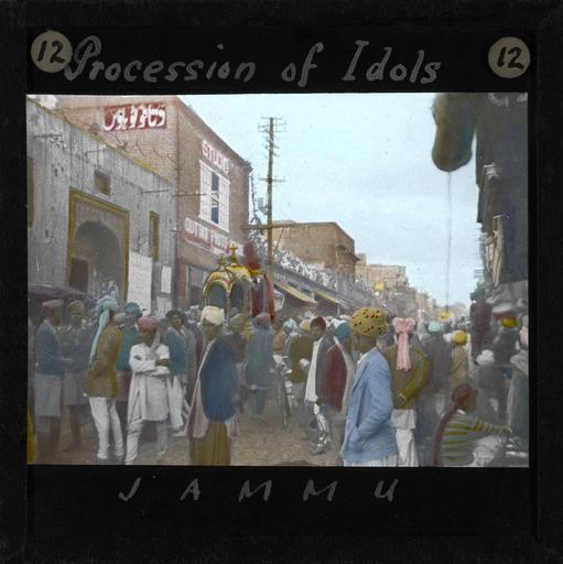 Keywords: Procession of Idols, Jammu, India, ca.1875-ca.1940 (imp-cswc-GB-237-CSWC47-LS10-012).jpg en <br> Procession of Idols Jammu India ca 1875-ca 1940 Photograph of a procession of idols through the streets of Jammu city A large group of people are gathered and an idol can be seen elevated from the crowd to the left of the picture The procession is on a street with brick buildings to either side ; This belongs to a series of Church of Scotland Foreign Missions Committee lantern slides relating to Jammu City which is also known as the City of Temples A mission station occupied by Church of Scotland missionaries was founded here in the late 19th/early 20th century Jammu is also one of the three administrative divisions within Jammu and Kashmir the northernmost state in India Photographer Unknown Filename imp-cswc-GB-237-CSWC47-LS10-012 tif Coverage date 1875/1940 Part of collection International Mission Photography Archive ca 1860-ca 1960 Geographic subject region Jammu and Kashmir Type images Part of subcollection Photographs from the Centre for the Study of World Christianity University of Edinburgh U K ca 1900-ca 1940s Repository name Centre for the Study of World Christianity Archival file impaunpub_Volume7/1728 url Repository address The University of Edinburgh School of Divinity New College Mound Place Edinburgh EH1 2LX United Kingdom Geographic subject country India Format aacr2 1 lantern slide 8 x 8 cm Geographic subject continent Asia Rights Contact the repository for details Part of series In the Temple City of Jammu LS10 Repository email divinity-CSWC ed ac uk Subject lcsh Keyword Worship; Religious gatherings Date created 1875/1940 Publisher of the digital version University of Southern California Libraries Subject aat genre exterior views Format aat lantern slides Legacy record ID impa-m69236 Access conditions http //www ed ac uk/schools-departments/divinity/research/centres/world-christianity/collections-resources File GB 237 CSWC47/LS10/12 1875/1940 author http //digitallibrary usc edu/cdm/ref/collection/p15799coll123/id/64846 PD-old-70-1923 Magic lantern images Images from USC Digital Library uploaded by Fæ International Mission Photography Archive ca 1860-ca 1960 Jammu Processions in India |