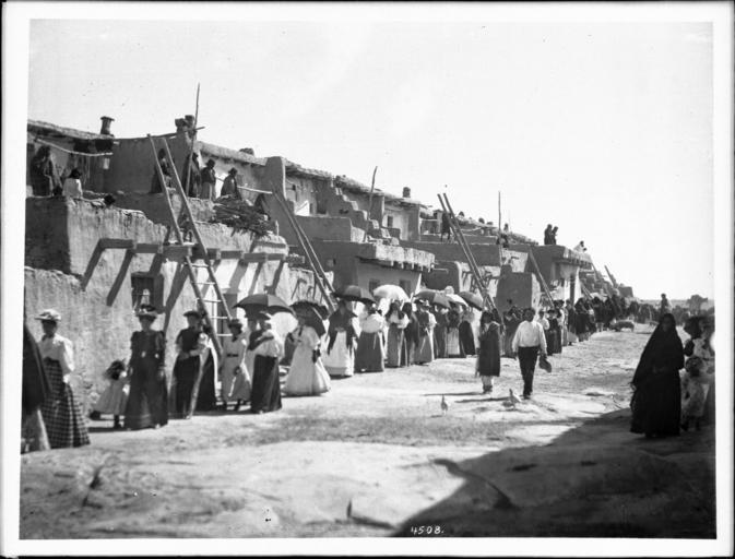 Keywords: Procession of Mexican and Indian women during the Fiesta de San Esteban (Saint Stephen), Acoma Pueblo, ca.1900 (CHS-4508).jpg en <br> Procession of Mexican and Indian women during the Fiesta de San Esteban Saint Stephen Acoma Pueblo ca 1900 Photograph of a procession of dozens of Mexican and Indian women during the Fiesta de San Esteban Saint Stephen Acoma Pueblo ca 1900 The women can be seen wearing full-length dresses walking in a procession Many are visible holding parasols over their heads Some children and men are visible as well The houses along the street are made of adobe with exposed rafter tails Several ladders leaning against the buildings provide access to upper levels Some people can be seen observing the procession from the roofs Call number CHS-4508 Legacy record ID chs-m16844; USC-1-1-1-13461 Photographer James George Wharton Filename CHS-4508 Coverage date circa 1900 Part of collection California Historical Society Collection 1860-1960 Type images Geographic subject city or populated place Acoma Pueblo Repository name USC Libraries Special Collections Accession number 4508 Microfiche number 1-160-10 Archival file chs_Volume96/CHS-4508 tiff Part of subcollection Title Insurance and Trust and C C Pierce Photography Collection 1860-1960 Repository address Doheny Memorial Library Los Angeles CA 90089-0189 Geographic subject country USA Format aacr2 2 photographs glass photonegative photoprint b w ; 17 x 22 cm Rights Digitally reproduced by the USC Digital Library; From the California Historical Society Collection at the University of Southern California Subject adlf cities Project USC Repository email specol usc edu Identifying number unidentified no James-850 Contributing entity California Historical Society Date created circa 1900 Publisher of the digital version University of Southern California Libraries Format aat photographic prints; photographs Geographic subject state New Mexico Format glass plate negatives Access conditions Send requests to address or e-mail given Phone 213 821-2366; fax 213 740-2343 Subject file heading Indians -- Acoma Subject lcsh Indians of North America; Acoma Indians Subject Acoma Indians; Acoma Indians; Acoma circa 1900 date created James George Wharton http //digitallibrary usc edu/cdm/ref/collection/p15799coll65/id/16766 PD-old-70-1923 Images from USC Digital Library uploaded by Fæ California Historical Society Collection 1860-1960 Glass plate negatives Acoma Pueblo Photographs by George Wharton James |
