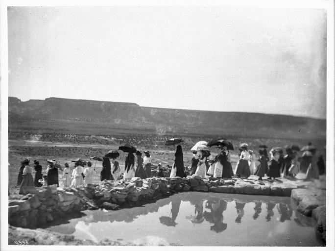 | Keywords: Procession of women next to the reservoir during the Fiesta de San Esteban (Saint Stephen), Acoma Pueblo, New Mexico, 1896 (CHS-4553).jpg en <br> Procession of women next to the reservoir during the Fiesta de San Esteban Saint Stephen Acoma Pueblo New Mexico 1896 Photograph of a procession of women next to the reservoir at the Fiesta de San Esteban Saint Stephen Acoma Pueblo New Mexico 1896 The procession of dozens of women many carrying open parasols reflect in the water of the small reservoir in the foreground as they walk along the rocky mesa top The women are walking towards the left Another mesa is visible in the distant background beyond a flat expanse of land dotted with bushes Call number CHS-4553 Legacy record ID chs-m16887; USC-1-1-1-13461 Photographer James George Wharton Filename CHS-4553 Coverage date 1896 Part of collection California Historical Society Collection 1860-1960 Type images Geographic subject city or populated place Acoma Pueblo Repository name USC Libraries Special Collections Accession number 4553 Microfiche number 1-60-53 Archival file chs_Volume96/CHS-4553 tiff Part of subcollection Title Insurance and Trust and C C Pierce Photography Collection 1860-1960 Repository address Doheny Memorial Library Los Angeles CA 90089-0189 Geographic subject country USA Format aacr2 2 photographs glass photonegative photoprint b w ; 17 x 22 cm Rights Digitally reproduced by the USC Digital Library; From the California Historical Society Collection at the University of Southern California Subject adlf reservoirs Project USC Repository email specol usc edu Identifying number unidentified no James-1395 Contributing entity California Historical Society Date created 1896 Publisher of the digital version University of Southern California Libraries Format aat photographic prints; photographs Geographic subject state New Mexico Format glass plate negatives Access conditions Send requests to address or e-mail given Phone 213 821-2366; fax 213 740-2343 Subject file heading Indians -- Acoma Subject lcsh Indians of North America; Acoma Indians Subject Acoma Indians; Acoma; Acoma Indians 1896 date created George Wharton James 1858 1923 http //digitallibrary usc edu/cdm/ref/collection/p15799coll65/id/16809 PD-old-70-1923 Images from USC Digital Library uploaded by Fæ Photographs by George Wharton James California Historical Society Collection 1860-1960 Glass plate negatives Acoma Pueblo |