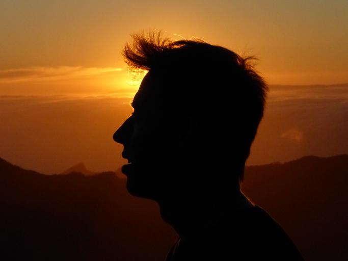 Keywords: profile silhouette head human person back light man hair windy sunset
