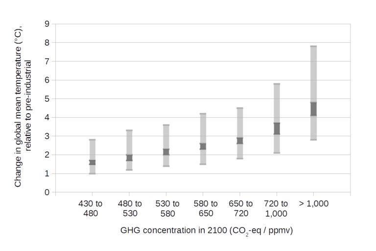 | Keywords: Projected global warming in 2100 for a range of emission scenarios.png pre-industrial times in the year 2100 for a range of scenarios Pre-industrial times are approximated as the years 1850 to 1900 7 sets of temperature projections are given for different atmospheric concentrations of greenhouse gases measured in parts per million of carbon dioxide equivalents in the year 2100 On the graph the dark grey area of the bar shows 10th to 90th percentile range of median estimates while the light grey area of the bar shows the 16th to 84th percentile range of the full distribution of results Graph data is tabulated in a later section References citation 2014 IPCC AR5 WG3 CITEREFIPCC AR5 WG3 Edenhofer O et al Climate Change 2014 Mitigation of Climate Change Contribution of Working Group III WG3 to the Fifth Assessment Report AR5 of the Intergovernmental Panel on Climate Change IPCC http //mitigation2014 org/report/final-draft/ Cambridge University Press harv Archived https //web archive org/web/20140629152007/http //mitigation2014 org/report/final-draft 29 June 2014 Data are taken from Table SPM 1 in http //report mitigation2014 org/spm/ipcc_wg3_ar5_summary-for-policymakers_approved pdf Summary for Policymakers p 13 archived https //web archive org/web/20140629044914/http //report mitigation2014 org/spm/ipcc_wg3_ar5_summary-for-policymakers_approved pdf 29 June 2014 Explanation of the projections is given in Figure 6 13 in http //report mitigation2014 org/drafts/final-draft-postplenary/ipcc_wg3_ar5_final-draft_postplenary_chapter6 pdf Chapter 6 Assessing Transformation Pathways p 34 archived https //web archive org/web/20140629152007/http //report mitigation2014 org/drafts/final-draft-postplenary/ipcc_wg3_ar5_final-draft_postplenary_chapter6 pdf 29 June 2014 2014-10-07 07 21 36 own Enescot other versions Data wikitable - GHG concentration Temperature - Full low Median low Median high Full high - 430 to 480 1 1 5 1 7 2 8 - 480 to 530 1 2 1 7 2 3 3 - 530 to 580 1 4 2 2 3 3 6 - 580 to 650 1 5 2 3 2 6 4 2 - 650 to 720 1 8 2 6 2 9 4 5 - 720 to 1000 2 1 3 1 3 7 5 8 - 1000 and greater 2 8 4 1 4 8 7 8 cc-zero Uploaded with UploadWizard Global warming graphs |