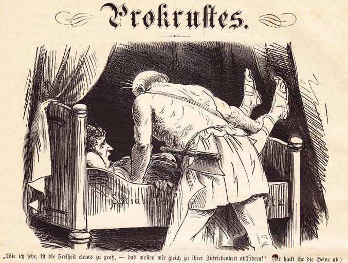 Keywords: Prokrustes.jpg en Caricature from 19th century German satirical magazine Berliner Wespen Berlin Wasps - Title Procrustes Caption Bismarck As I see Lady Liberty is somewhat too large - we want to change this immediately to her contention He chops away her legs - Inscription on bed Socialist Law de Karikatur aus der deutschen Satirezeitschrift Berliner Wespen - Titel Prokrustes Unterschrift Bismarck Wie ich sehe ist die Freiheit etwas zu groß - das wollen wir gleich zu ihrer Zufriedenheit abändern Er hackt ihr die Beine ab - Aufschrift auf dem Bett Sozialistengesetz 1878-08-30 http //freisinnige-zeitung de/archives/8094 Not given PD-old Berliner Wespen Uploaded with UploadWizard Procrustes Allegories of liberty 1878 in Germany |