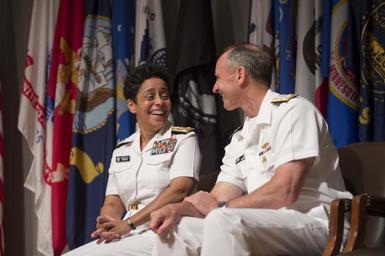 | Keywords: Promotion ceremony 140701-N-WL435-185.jpg en Chief of Naval Operations CNO Adm Jonathan Greenert and Vice Adm Michelle Howard share a laugh on stage during her promotion ceremony at the Women in Military Service for America Memorial Secretary of the Navy SECNAV Ray Mabus promoted Howard to the rank of admiral in the presence of family and friends Howard is the first woman to be promoted to the rank of admiral in the history of the Navy and will assume the duties and responsibilities as the 38th Vice Chief of Naval Operations from Adm Mark Ferguson U S Navy photo by Chief Mass Communication Specialist Peter D Lawlor/Released 2014-07-01 Petty Officer 1st Class Peter Lawlor https //www dvidshub net/image/1430985 140701-N-WL435-185 2014-07-01 22 52 WASHINGTON DC US PD-USGov-Military-Navy Mark E Ferguson III Ray Mabus Jonathan W Greenert in 2014 Images from DoD uploaded by Fæ |