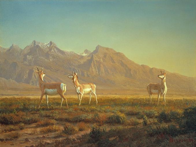| Keywords: Prong-Horned Antelope-Albert Bierstadt.jpg Artwork Creator Albert Bierstadt ca 1865 oil canvas cm 42 9 57 2 National Museum of Wildlife Art object history Gift of the Stonehollow Collection National Museum of Wildlife Art credit line accession number W2008 018 http //www wildlifeart org/ViewArtwork/index php tID 576 National Museum of Wildlife Art PD-old-100 Landscape paintings of the United States by Albert Bierstadt Antilocapra americana 1865 paintings in the United States National Museum of Wildlife Art 1860s landscape paintings |