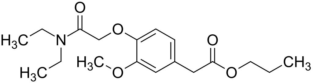 | Keywords: Propanidid 200.svg validSVG Structure of propyl 2- 4- 2- diethylamino -2-oxoethoxy -3-methoxyphenyl acetate Own 2014-05-18 Emeldir <span class signature-talk ></span> Chemical structure verified https //upload wikimedia org/wikipedia/commons/0/02/Propanidid_200 svg 1S/C18H27NO5/c1-5-10-23-18 21 12-14-8-9-15 16 11-14 22-4 24-13-17 20 19 6-2 7-3/h8-9 11H 5-7 10 12-13H2 1-4H3 KEJXLQUPYHWCNM-UHFFFAOYSA-N 1421-14-3 Synonyms <small><nowiki>13245 R P 2180 TH Bayer 1420 Bayer-1420 BRN 2952046 Epontol Fabantol Fabontal FBA 1420 FBA-1420 Propanidid Propanidido Propanididum Propantan Propyl 4-diethylcarbamoylmethoxy-3-methoxyphenylacetate Propyl 4-diethylcarbamoylmethoxy-3-methoxyphenylacetate Propyl 4- diethylcarbamoyl methoxy-3-methoxyphenylacetate Sombrevin TH-2180 WH 5668 WH-5668</nowiki></small> PD-chem Propyl esters Carboxylate esters Methoxybenzenes Phenol ethers N N-disubstituted primary amides |